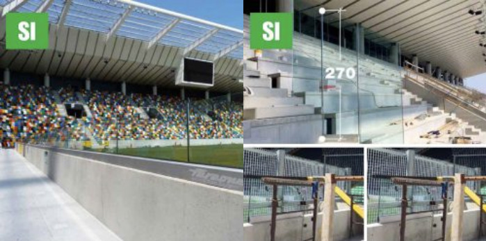 RESISTENZE +4.5 kN/m (certificate in classe C3). Ninfa STADIO, Ninfa 3 e Ninfa 90 con vetri temprati stratificati con SG (Sentry Glass, plastico rigido) e fissaggi certificati. (Prove in cantiere, stadio di Udine).